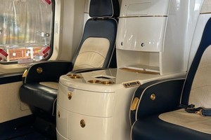 Cabin features Two single seats opposite four seats. Finished in two tone navy and beige leather. Gold plated hardware.