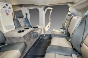This five (5) passenger interior features two (2) aft facing captain chairs separated by an armrest positioned across from a three (3) place bench seat.