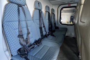 12-padded crashworthy comfortable seats fabric or leatherette covered (with inertial reels and safety belts) disposed on 3 rows