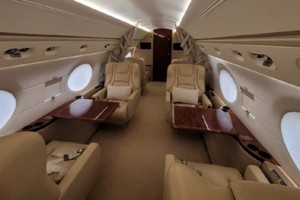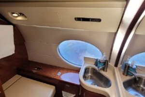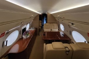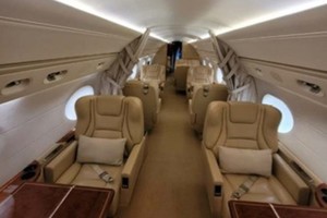 This elegant (14) passenger executive passenger interior features three distinct passenger cabin areas with a forward galley, forward crew lavatory, aft lavatory, four-person conference group, aft cabin divan, and electric window shades.