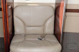 | The beautiful 8 passenger configuration features a forward cabin 4-place club with a cabin monitor and 2 executive tables. The aft cabin follows with a 4-place club with 2 executive tables and has an aft belted lav. |