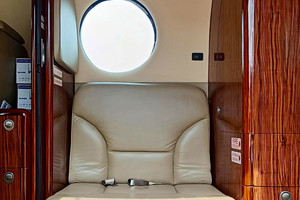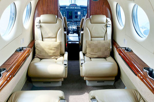 Stylish Eight (8) Passenger Executive Interior Featuring a Double Club Configuration with Pull Out Executive Tables, Cup Holders and Drop-down Inboard Armrests at Each Seat; Providing Maximum Comfort for the Passengers. All Seating is Completed in Well-appointed Light Beige Colored Leather with a Complimenting Headrest
