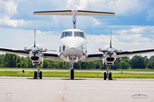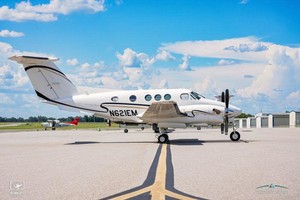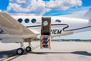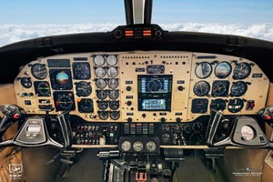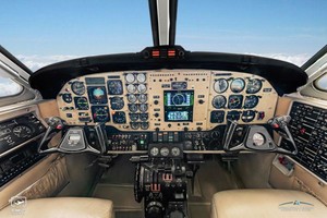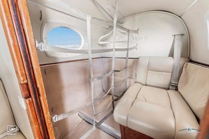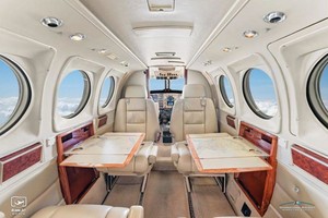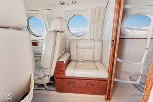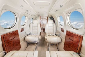 | Fawn Beige leather with Camel carpet, forward refreshment center, belted flushing lavatory. Dual executive writing tables finished in high gloss burlwood with matching partitions and cabinetry. |