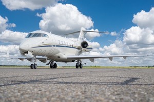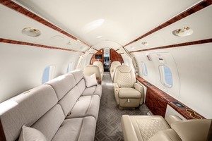 Ten passenger interior features forward four place club seats with executive foldout tables, followed by two club seats opposite three place divan, and aft belted 16G lavatory seat for tenth passenger. All club seating is completed in Desert Floor leather, with divan in coordinating Eggshell fabric.