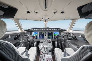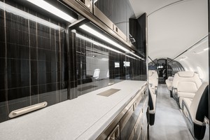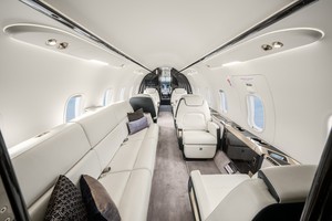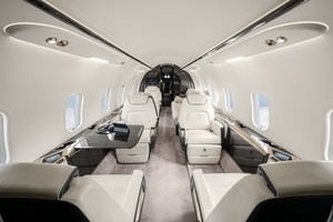 Ten (10) passenger interior includes forward four place club configuration with dual fold out tables, aft right two place club seats with insertable table opposite left three place divan, and aft belted lavatory seat. Cabin is appointed with two tone seats and two tone dado panel. Forward refreshment includes large ice drawer and china, crystal and flatware inserts. Touched up Dec 2022.