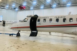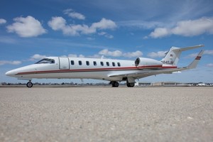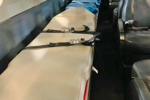 Four place passenger interior arranged in a double club setup on the left hand side completed in gray leather and matching sidewalls. Oopposite two EMS beds on the right hand side, Aft belted lavatory equipped with pocket doors, 110-Volt Cabin Power System, 110-Volt Cockpit Power System, Cockpit Mute Switch Mod, Galley Rest Seat, Single 10.6 Monitor Located in the Forward Bulkhead, Rosen Aviation Rosen View LX Moving Map