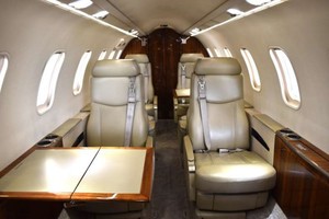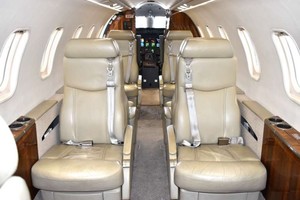 cockpit features a privacy curtain, and the fully-enclosed lavatory has privacy pocket doors. Seating consists of forward and aft four-place club seating groups with executive foldout tables, along with a belted lavatory seat. A galley rest seat is located on the forward entry bulkhead for in-flight use only. Various storage compartments and cabinets are located throughout the interior, including a crew closet, crew manual storage, a lavatory closet, and optional passenger seat base drawers.