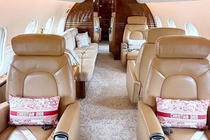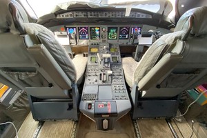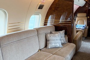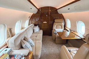 - Seating: Tan leather seating, four forward executive seats, mid-cabin 3-place berthable divan opposite dual executive club seats, aft 4-place conference group opposite dual executive club seats