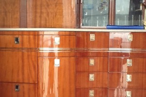 High gloss cabinetry is light in color accented by the gold-colored plating and light beige leather found on all individual chairs.