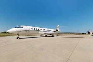 Aircraft painted Matterhorn White with Dark Shade Blue and Pharoah’s Gold accent stripes on the fuselage and tail