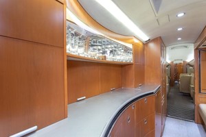 Mid Cabin: Four-place (4) conference group with credenza opposite a two-place (2) foldable, hidden divan.