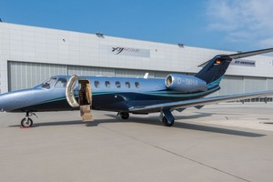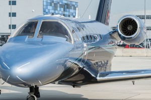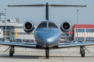 Colours The aircraft features a sleek dark blue and light blue gradient livery with silver and turquoise accent lines.