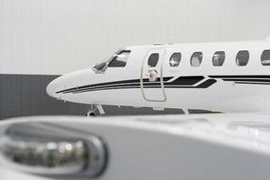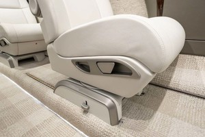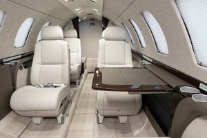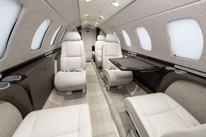 A sophisticated seven (7) passenger belted lav configuration featuring a refreshment center with a side facing seat, a four-place club following two forward facing seats in the aft cabin. All with swivel capabilities and foldout executive tables.