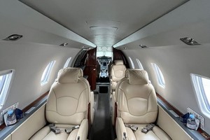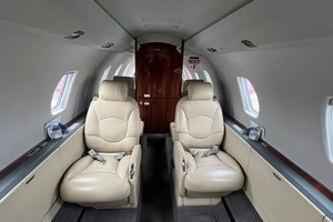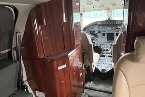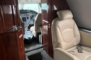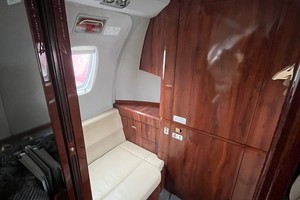 -Eight (8) Passenger configuration including Four (4) executive club seats with fold-out tables in the aft cabin and Three (3) executive club seats with one fold-out table in the forward cabin. Forward galley. (1) Aft lavatory seat . Wood is medium-dark in color and is nearly flawless. Leather is lighter color, a darker shade of tan.