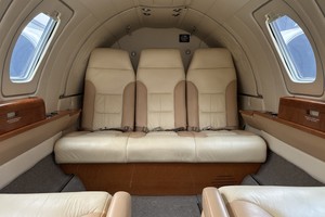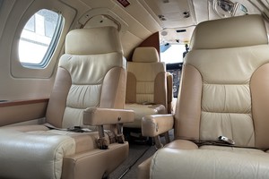 Interior features comfortable leather seating for up to 7 passengers in a beige, tan and brown color scheme. Club seating with dual folding tables and bench in aft cabin; rear facing seat and belted emergency toilet in fwd cabin.