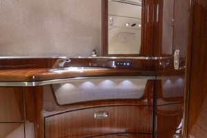 LH Forward refreshment center with Microwave and RH Forward closet. Single LH side facing belted seat and RH non belted flushing toilet in the enclosed Aft Lavatory.