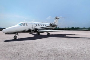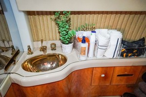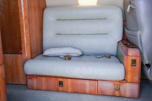 & additional detail work. Forward refreshment center. Airline-style electric fl ushing belted aft lav.