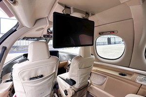 3 Passenger Seats (1 Cockpit 2 rear) in beige leather with beige headliner, two fold-up Tables, center cabinet, 115V AC Power outlets, SATCOM (Garmin), Cabin Passenger 22” Entertainment Display with Airshow and Inflight (EVS) Camera