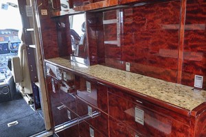The cabin is configured with a large forward galley followed by a four (4) place club arrangement and an aft three (3) place divan opposite two (2) club chairs. Individual chairs are completed in light tan leather, the divan is covered in a coordinating lightly patterned fabric and new carpeting (2020). The high gloss dark colored woodwork is complimented by the Satin Nickel plating.