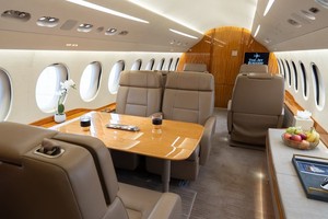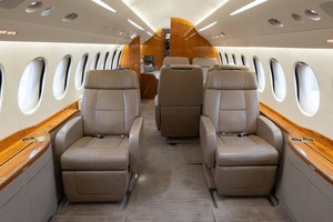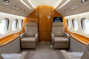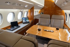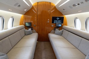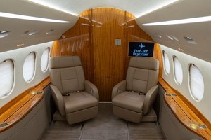 Executive fourteen (14) passenger interior featuring a four-place club in the forward cabin, a four-place conference table facing a credenza in the mid cabin, and dual three person berthable divans in the aft cabin. This aircraft also features a forward galley, forward crew lavatory, spacious aft passenger lavatory, in-flight accessible baggage, and cockpit jumpseat.