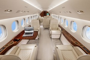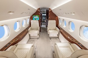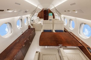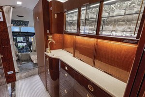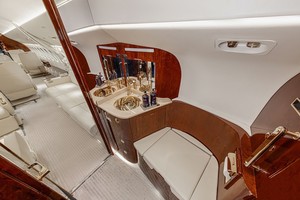 Cabin is confi gured with a forward four-place club, mid-cabin four-place dining group and aft-cabin with aft berthable divan opposite two captain’s chairs. The forward cabin’s forward-facing seats feature manually controlled leg rests, and all four seats have electric lumbar support, increased seat height, winged headrests, and berthing. Aircraft is set up for multiple meal services while enroute, with room for four (4) air cooled catering boxes, Convection Oven, separate Microwave, Factory installed Nespresso unit and hot and cold storage. Passenger entertainment includes Rockwell Collins Tailwind® 500 Satellite TV system, dual (2) bulkhead monitors, six (6) Rosen in-seat monitors, Airshow system and Six (6) Otonomy cameras for inflight exterior views. When parked the cameras also provide security for the aircraft. Wireless High-Speed Internet is provided by Honeywell HD-710 Inmarsat SwiftBroadband service.