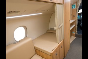 16 Pax floor plan w/ 3rd Crew Seat, Crew Rest Area, Galley pocket door, Fwd and Aft Vacuum Lavatories, Mid Cabin curtain, 2 Divans in Aft Cabin