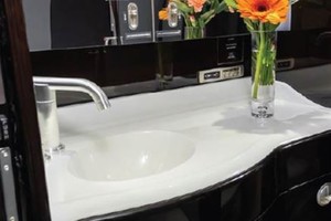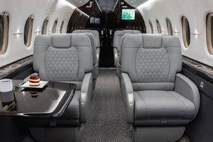 8 passenger interior in Grey leather, plus aft, belted toilet with vanity. Forward and aft – 4-place club. Dark wood veneer cabinetry with chrome plate accessories. Forward galley with TIA microwave, oven, fridge and sink with hot and cold water.