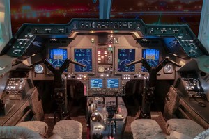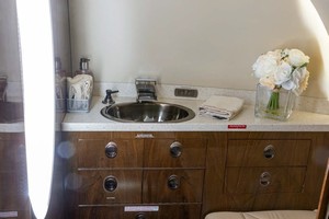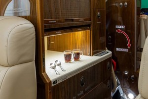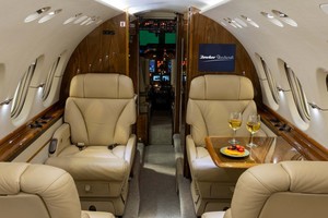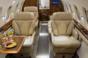 Eight passenger interior features five cabin chairs and threeplace divan with Belted Lov. New Cabin and cockpit carpet, new lower side wall covering (Elliott Aviation 7/24)
