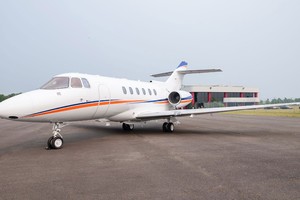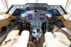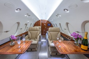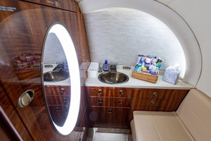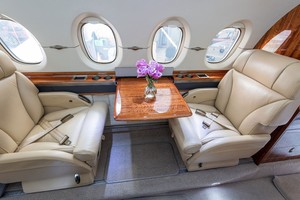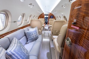 Executive (8) eight passenger interior features a forward 4-place club, aft 3-place divan and single seat, cockpit jumpseat (removable) and crew seats with sheepskin. Cabin amenities include dual forward fold out tables and aft fold out table.