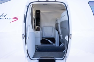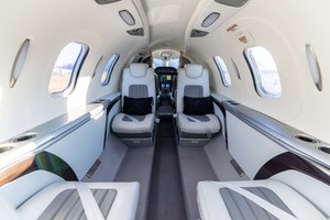 Four dual tone passenger seats in an executive club configuration with a side facing seat.