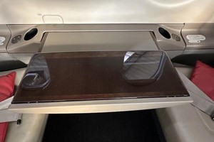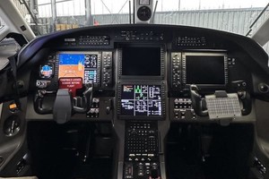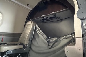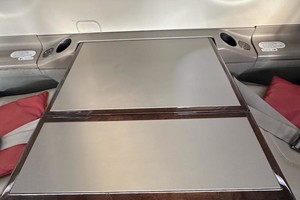 | Eight passenger executive interior features a forward club configuration, followed by four aft forward-facing seats. All seating is Beige leather, with lower sidewalls in coordinating fabric. Dual executive folding tables in forward club position, DVD/Audio Passenger Entertainment System. |