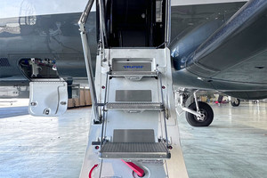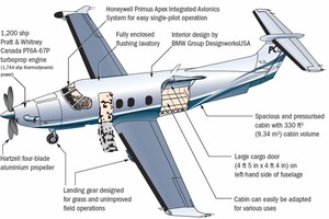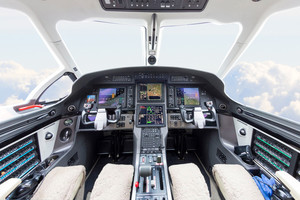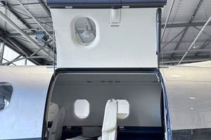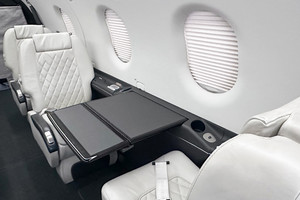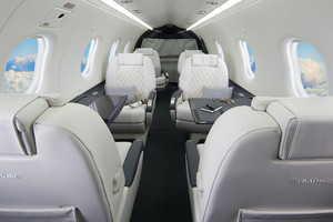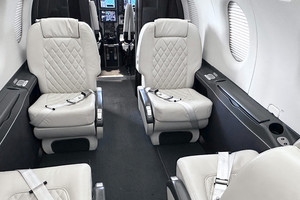 | BMW Design Interior with Six (6 2) executive seating in beige cream multicolor leather, Four (4) Club and two (2) fwd. Facing Seats with footrests plus 2 Flip Seats, Brown Wood Veneer, 330 Cubic Feed Stand up Cabin, Pax and Cargo Door, interchangeable Seats, on-board Internet (Aerowave 100) and Satphone (Iridium Antenna). |