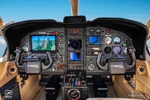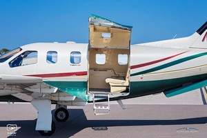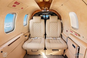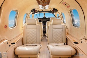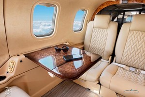 | Executive 6 Passenger Configuration, 4 Place Club Seating Completed in 2025 with new Tan Leather Seating, 2025 Tan Carpeting, Ultrasuede Headliner, Rich Brown Wood Trim, Gold Accents and an Executive Writing Table. |