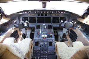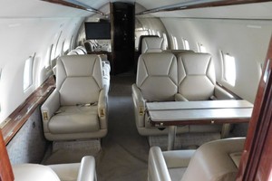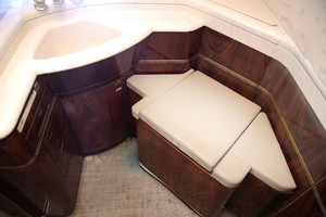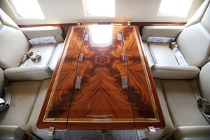 12 passenger interior in Beige leather. Forward - 2-place club opposite a 4-place conference group around a hi lo table. Aft – 2-place club, opposite a 4-place divan in Beige fabric. High gloss, medium wood veneer cabinetry with Gold plate accessories. Aft toilet with vanity. Forward S-galley with sink, coffee maker and warming oven.