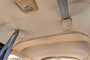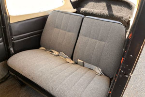 Gray fabric and vinyl seats with matching side panels and carpet with mats. Cream headliner. Overall good condition. Rated 8 out of 10.
