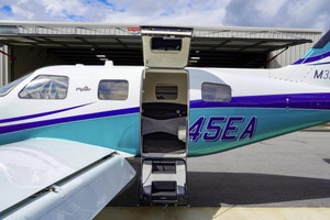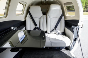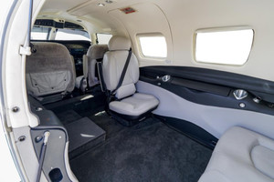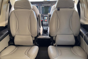 | Executive 6 Passenger Configuration, 4 Place Club Seating, Cream Leather Seating, Dark Grey Carpeting, Executive Writing Table, & USB Charging Ports. |
