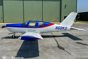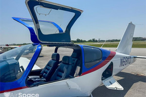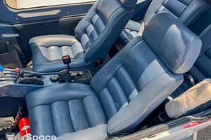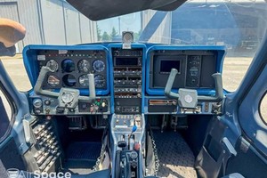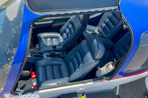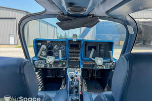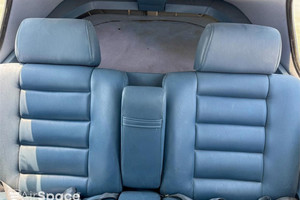 The interior of the aircraft is in good condition, featuring blue leather seats, a matching blue headliner and carpet, and clear glass throughout.