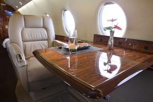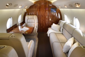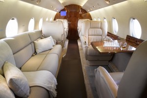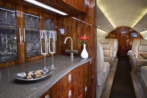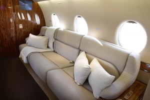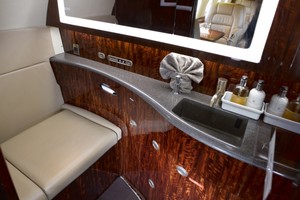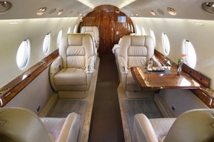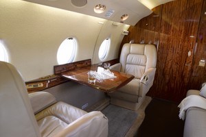 | Executive/9 passengers. Forward 4-place club, aft 3-place divan opposite 2-place club. Forward galley. Airshow w/dual 14-inch monitors, Alpine DVD player, Blaupunkt 5-disc CD changer and Galley pocket door. Fully enclosed aft lav. |