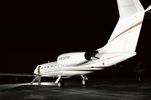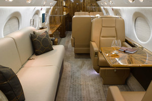 New Interior in 2018 by Gulfstream. 14 passenger executive interior featuring a forward four (4) place club arrangement followed by a mid-cabin two (2) place club opposite a fabric divan. The aft cabin offers a four (4) place conference group opposite a credenza with a convenient monitor. The aft galley is fully equipped and features convection and microwave ovens. All individual chairs are completed in Tan colored leather, divan is a coordinating fabric complimenting the carpeting which runs throughout the cabin. The cabinetry is a high gloss Light colored Wood Veneer complimented by brushed Gold colored plating. Full cabin virtual walkthrough available on below link. |