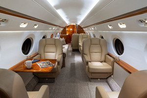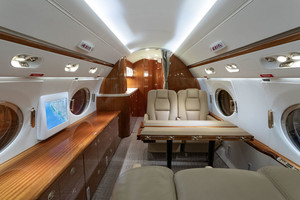 | (2019 Interior was recently refurbished with new coverings of panels, PSU, upper/lower sidewalls and ceiling, new carpet, new divan covering and reconditioned seats.) This beautiful 14 passenger configuration features a forward four-place club, followed by a mid-cabin 4-place couch opposite two club seats, and an aft 4-place conference group opposite a credenza. The aft galley features a high temperature oven, microwave oven, coffeemaker and sink. |