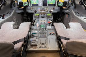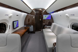 | This elegantly appointed eleven (11) passenger floor plan features three distinct passenger cabin areas with a forward galley, electric window shades, and an in-flight accessible baggage bay. Forward Vestibule: Forward crew rest and crew lavatory. Forward Galley: Equipped with a microwave, high temp oven, refrigerator and coffee maker. Forward Cabin: Forward area features 4-place club. Mid Cabin: 4-place club. Aft Cabin: 3-place divan opposite a credenza on the right.Forward and Aft Lavatories: Forward and aft vacuum toilets with outside servicing capability. |