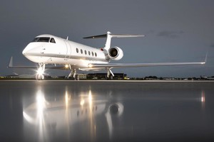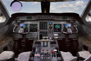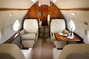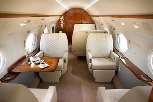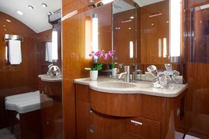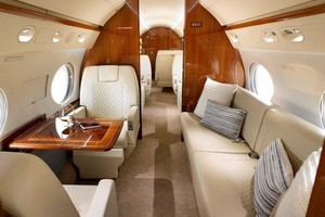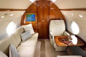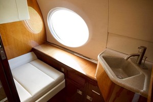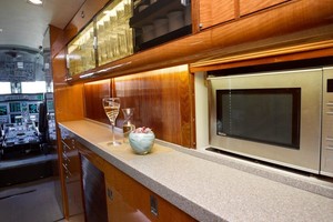 | Exquisite fourteen (14) passenger fireblocked interior featuring a fully equipped forward galley with ample storage for china, crystal, flatware and ice. There is a solid pop-up door separating the galley from the forward cabin for additional privacy. The forward cabin offers a two (2) place club with pull out tables opposite a four (4) place berthable divan, a second pop up door provides the option for complete privacy in the forward cabin area. The mid cabin offers a four (4) place club arrangement with pull out tables followed by an aft four (4) place conference group opposite a credenza. Forward crew and aft full-service lavatories offer vacuum systems and are externally serviceable. The aft lavatory features a closet for additional storage as well as a convenient dressing area. |