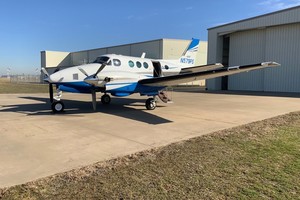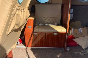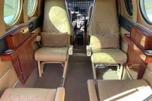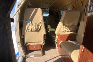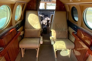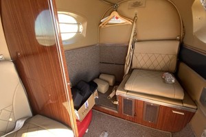 Executive six passenger interior is completed with camel leather seating, four cabin chairs, side-facing bar seat, and crew seats with sheepskin inserts. Headliner is Pecan ultraleather, sidewalls are Glen Dronach leather with Pecan ultraleather, cabinetry and woodwork are Bronze ribbon mahogany woodwork. Additional cabin amenities include pecan ultraleather window panels, baggage curtain and belted lavatory seat. Carpet replaced by Aero Plus Interiors and seating by Alredo’s Upholstery in September, 2019.