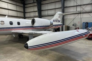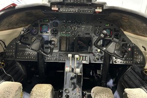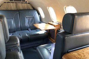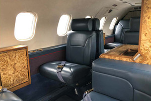 | Refurbished 01/01/2016 by West Star (Rating: 9) Dark Blue leather seating with complimentary carpeting and headliner. Four adjustable pedestal seats in a mid-cabin club configuration with dual folding tables, an aft cabin three-place divan and a forward side-facing belted lavatory seat with sliding privacy door. |