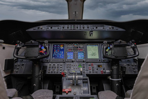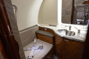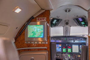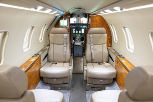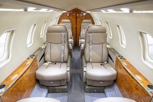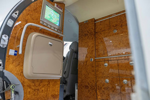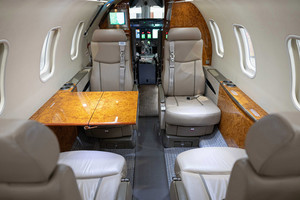 | Nine passenger interior. Tan Leather Swivel Chairs, Dual Executive Club Configuration with executive fold-out tables. Forward storage closet, forward galley w/warming oven. Belted lav, Tan closed look wool carpet, Satin Nickel plating, wood is Burled Walnut medium stain with hi gloss finish, 10.4â forward monitor. |