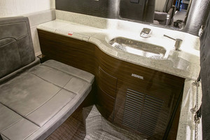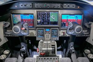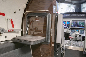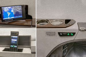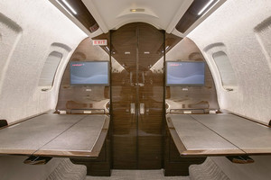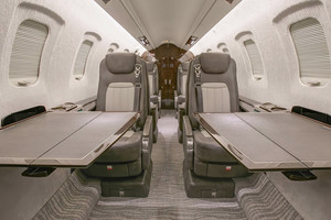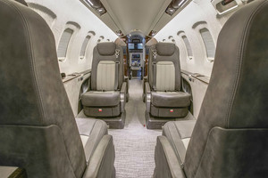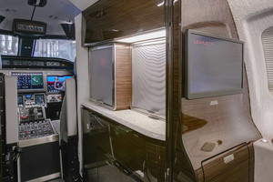 | Six (6) Passenger Executive Seating (2 VIP Single with foot rest and table and Monitors and 4 Club seat Configuration) dual color Leather, Fold out Galley Seat (non-belted), Cockpit/Cabin Pocket door (Noise), lavatory with sink - separated by a sliding door for privacy and external serviceable, large refreshment center with Microwave and Coffee Maker, all cabinetry in earl oak wood, brushed aluminum hardware, SAT-Phone (Aero V) and WIFI, SWIFT Broadband, 110V Power outlets Cockpit and Cabin, Lufthansa NICE Cabin Management with 3D Airshow, Entertainment System, cabin LED lights. |