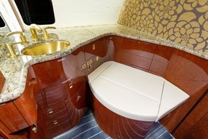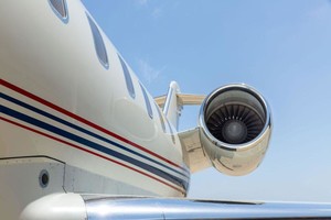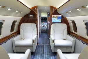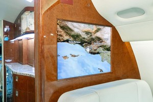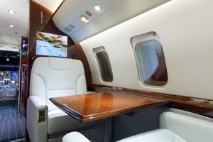 | Exquisite 10 passenger cabin features a four-person club seating arrangement in the forward cabin, followed by a right four-person divan across from two passenger seats in the aft cabin. A well-equipped forward galley, aft lavatory, in-flight accessible baggage bay, and cockpit jumpseat (certified for takeoff and landing, crew only) completes this interior. |
