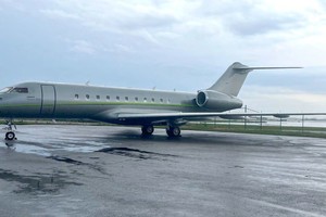 Aircraft is Painted Titanium with Dark Gray and Green Accent Stripes on the Fuselage