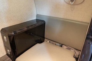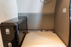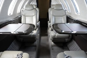 | Executive 8 Passenger configuration. Featuring upgraded 2 place divan across from entry door, 3-place club in the forward cabin, and two forward-facing seats in the aft cabin. Enclosed flushing lavatory in the rear. |