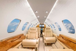 | Nine Passenger, Tan Leather Seating, Four (4) PI Club Opp Two (2) Seats w/Three (3) PI Side Facing Bench Seat, Two (2) Exec Writing Tables, Dual (2) Mid Cabin Pyramid Cabinets, CD Player, Aft Lav. |